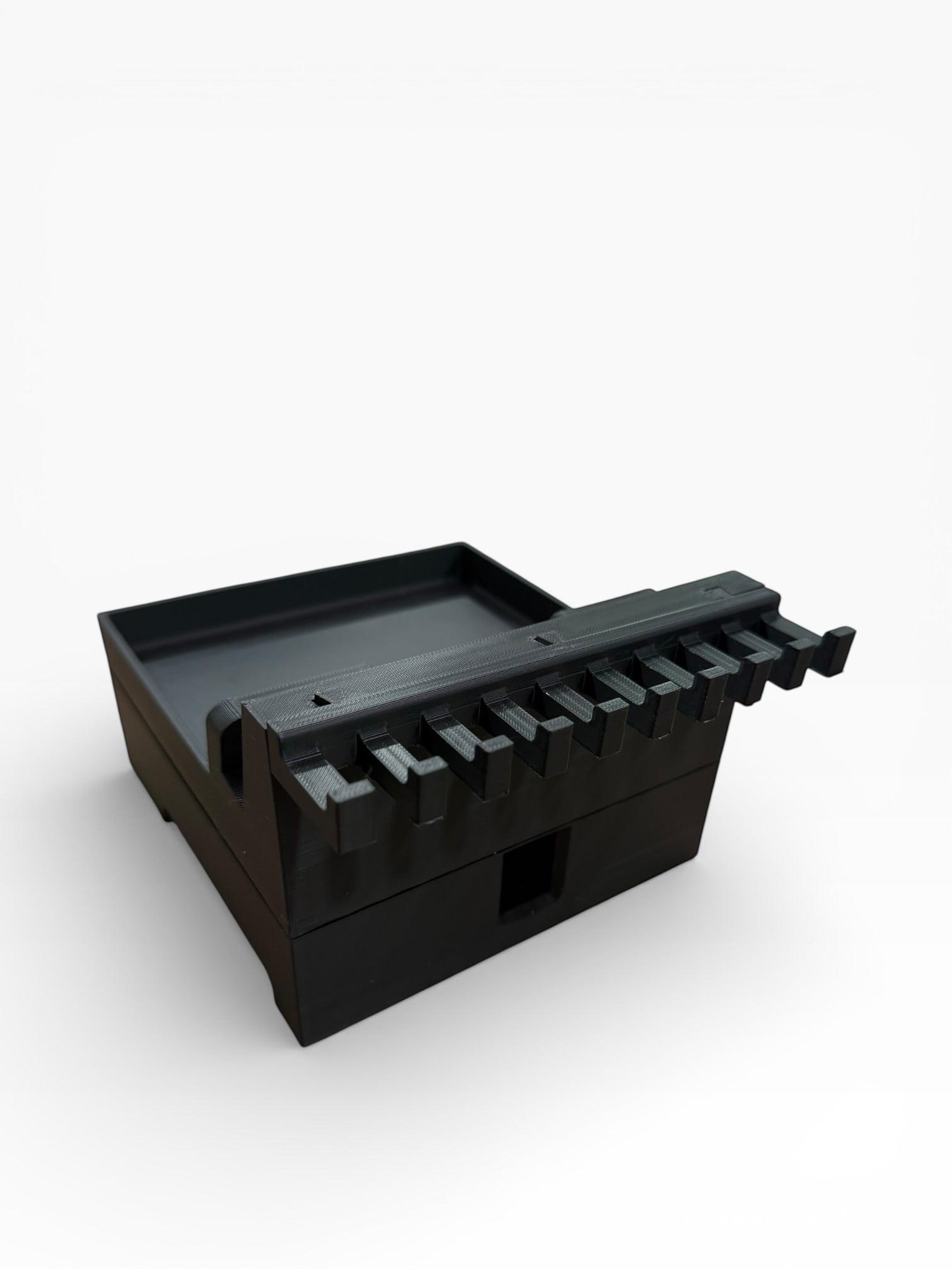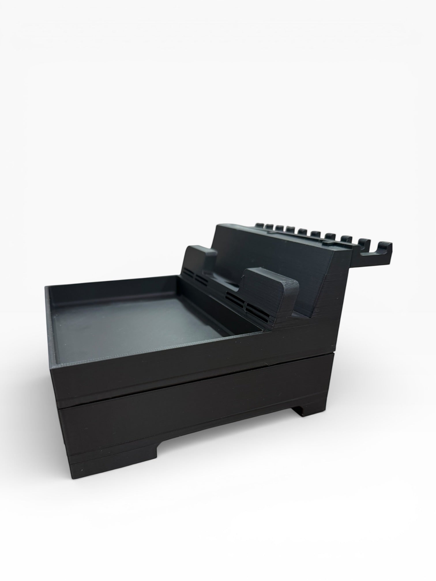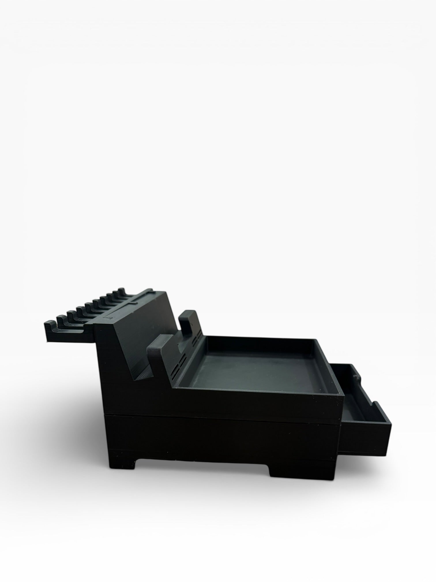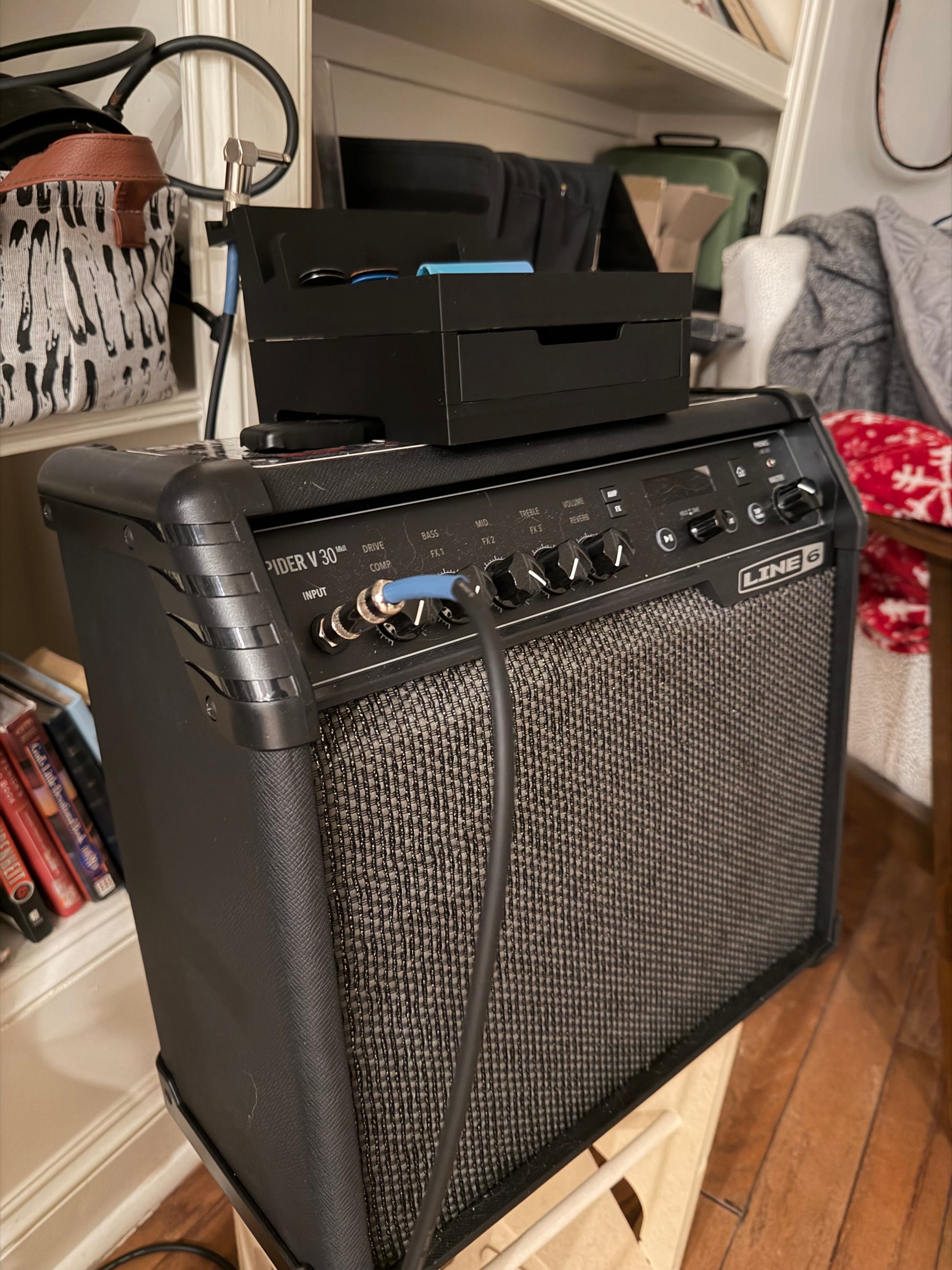 A clean amp-top organizer for picks, capos, slides, and strings — perfect for home practice and studio setups.