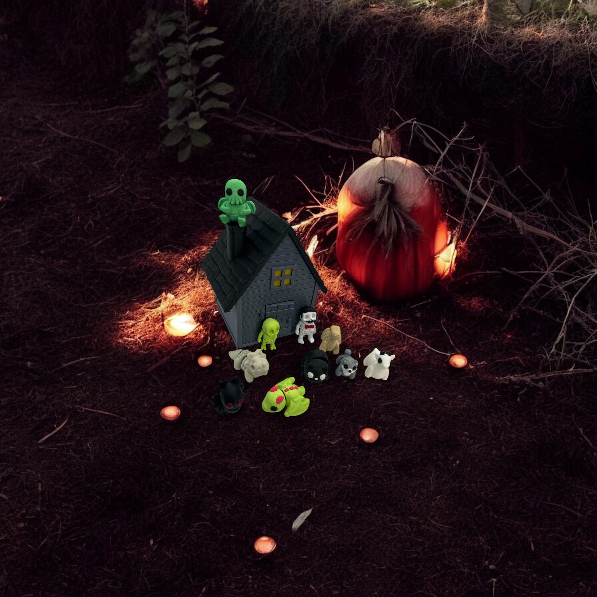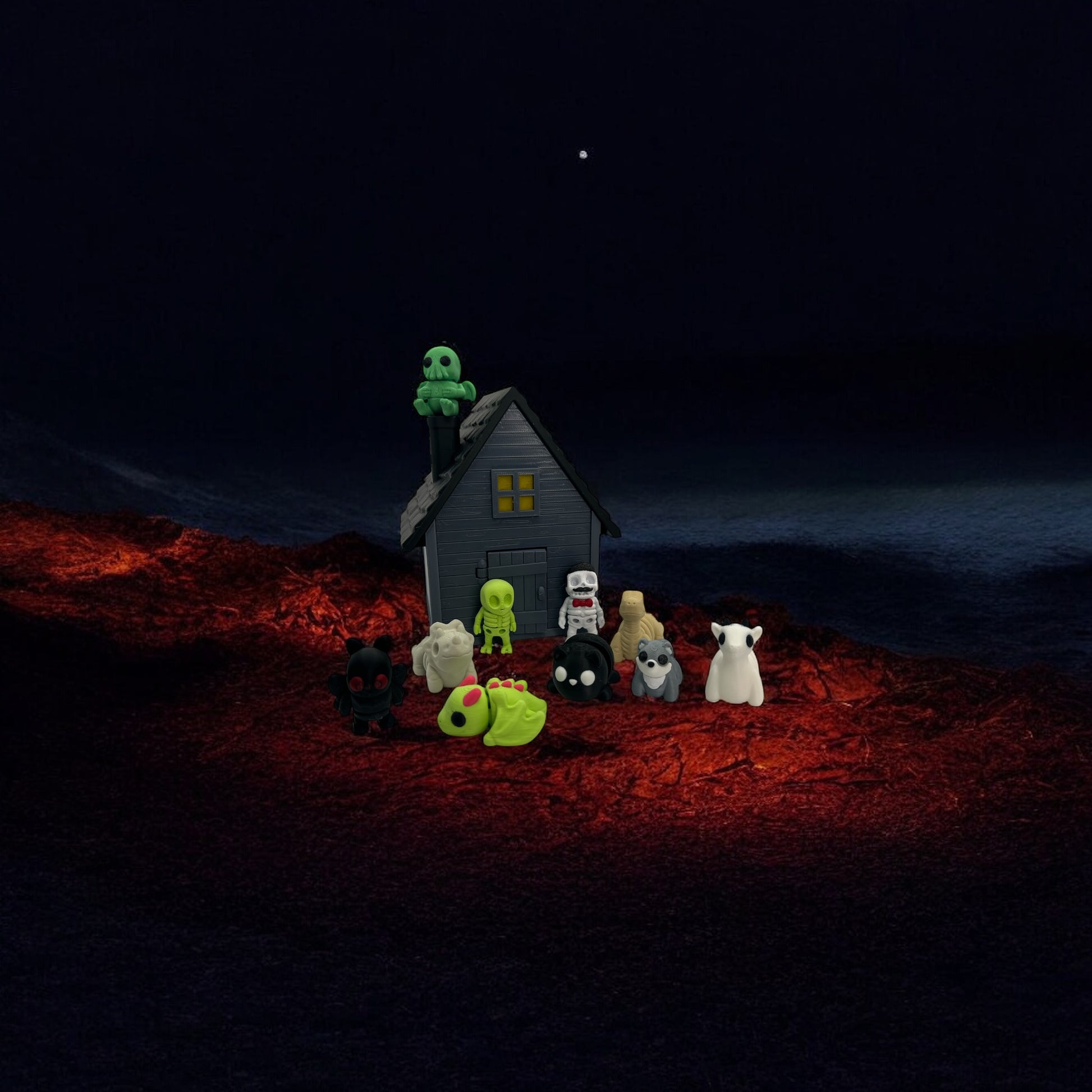 Perfect for Halloween décor, spooky shelf sitters, or as a fun gift for fans of the cute-but-creepy aesthetic. The haunted house makes the perfect backdrop, turning this set into a ready-to-display scene straight out of a monster storybook.